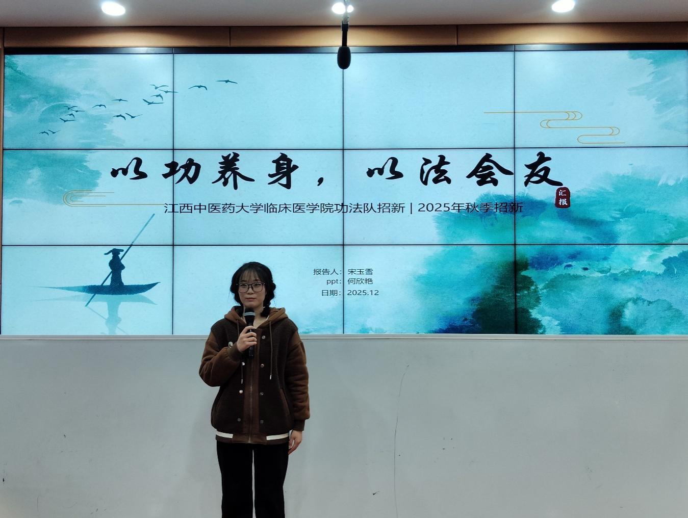 为弘扬传统中医药文化,推广八段锦等传统养生功法,引导同学们树立健康生活理念,12月5日晚,临床医学院团委组织部于1301教室举办了以“承古法之韵,启健康之道”为主题的功法知识分享活动。本次活动邀请到了功法队队长宋玉雪担任主讲人。