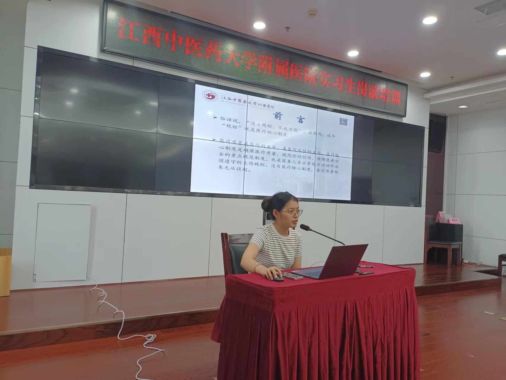 其次医务部详细讲解了医疗文书书写规范及医疗核心制度,信息科向实习生演示了电子病历操作系统,院感科讲解了院感相关知识及院内感染的相关注意事项。