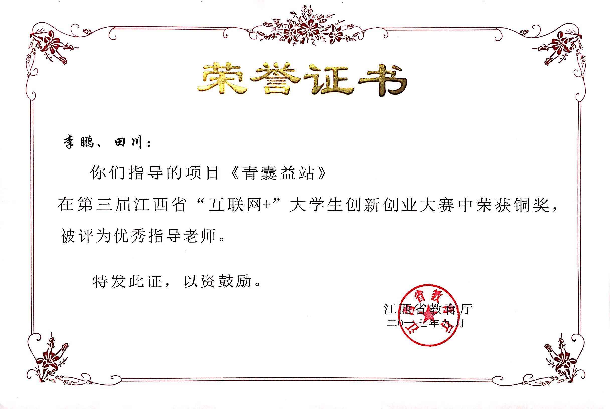 2017.9 第三届江西省“互联网+”大学生创新创业大赛铜奖(老师)