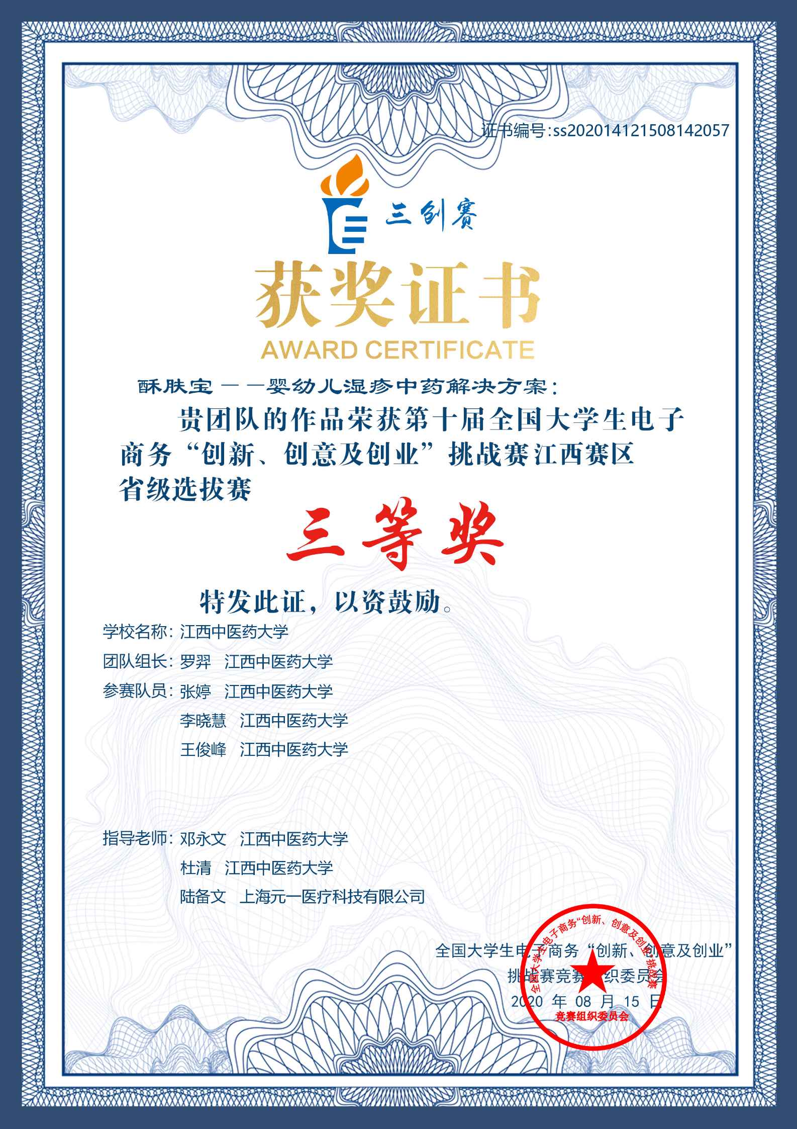 2020.8第十届全国大学生电子商务“创新、创意及创业”挑战赛江西赛区省级选拔赛三等奖(酥肤宝)