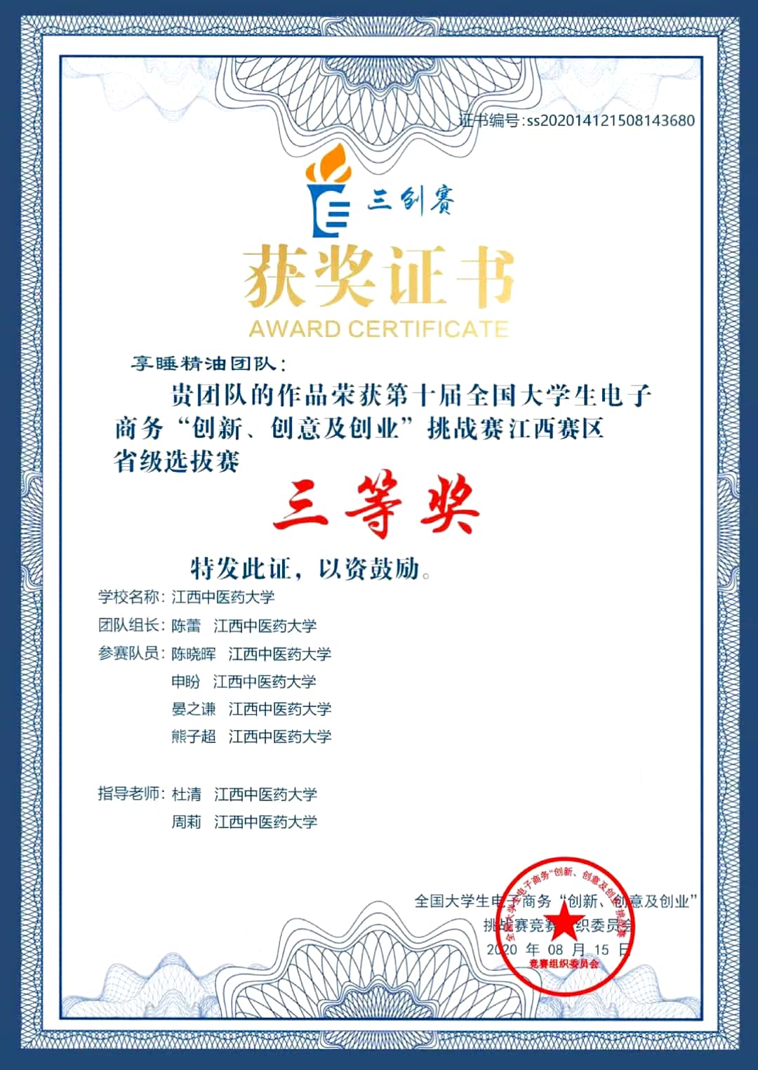2020.8第十届全国大学生电子商务“创新、创意及创业”挑战赛江西赛区省级选拔赛三等奖(享睡精油)