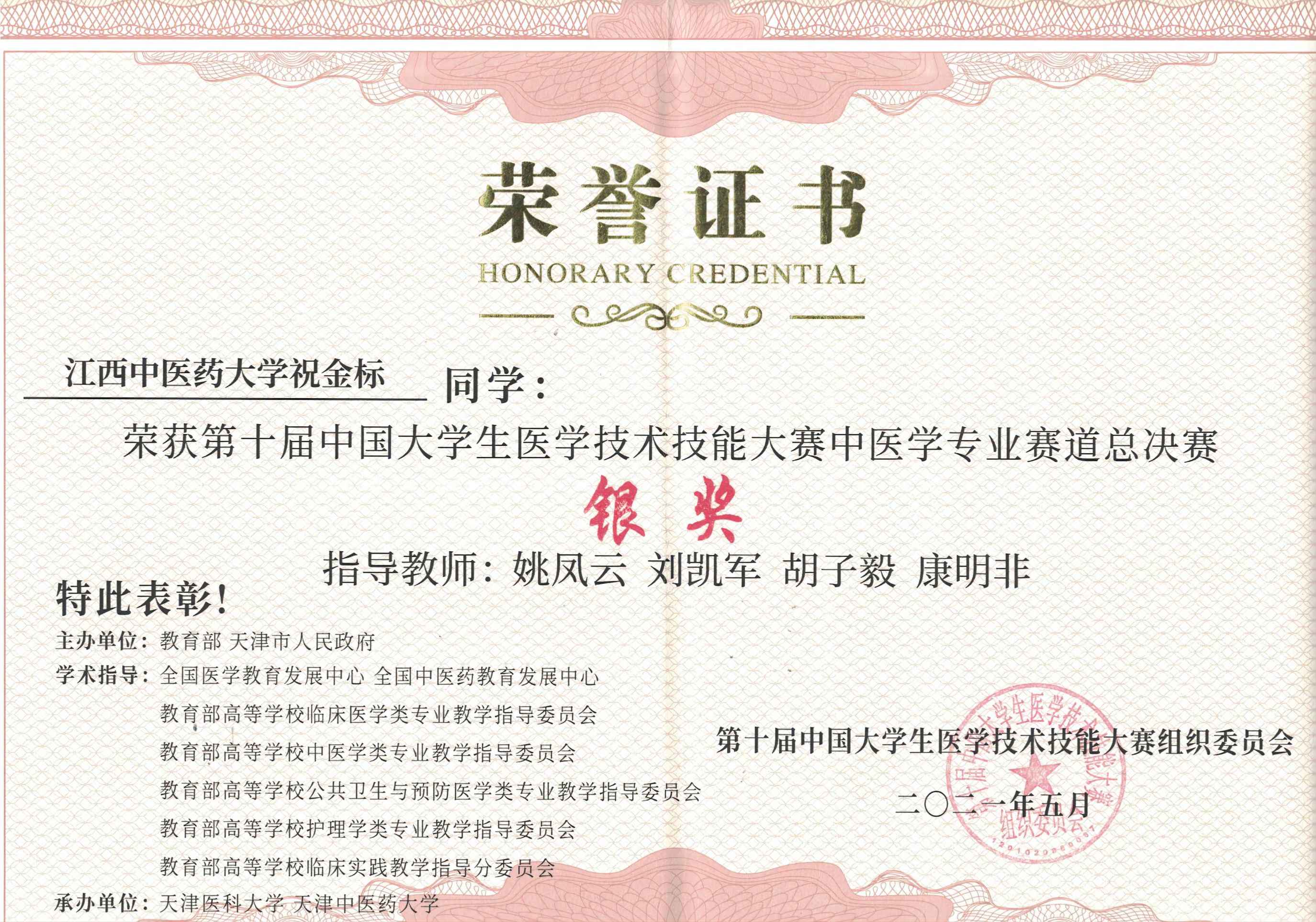 祝金标获第十届中国大学生医学技术技能大赛中医学专业赛道总决赛银奖