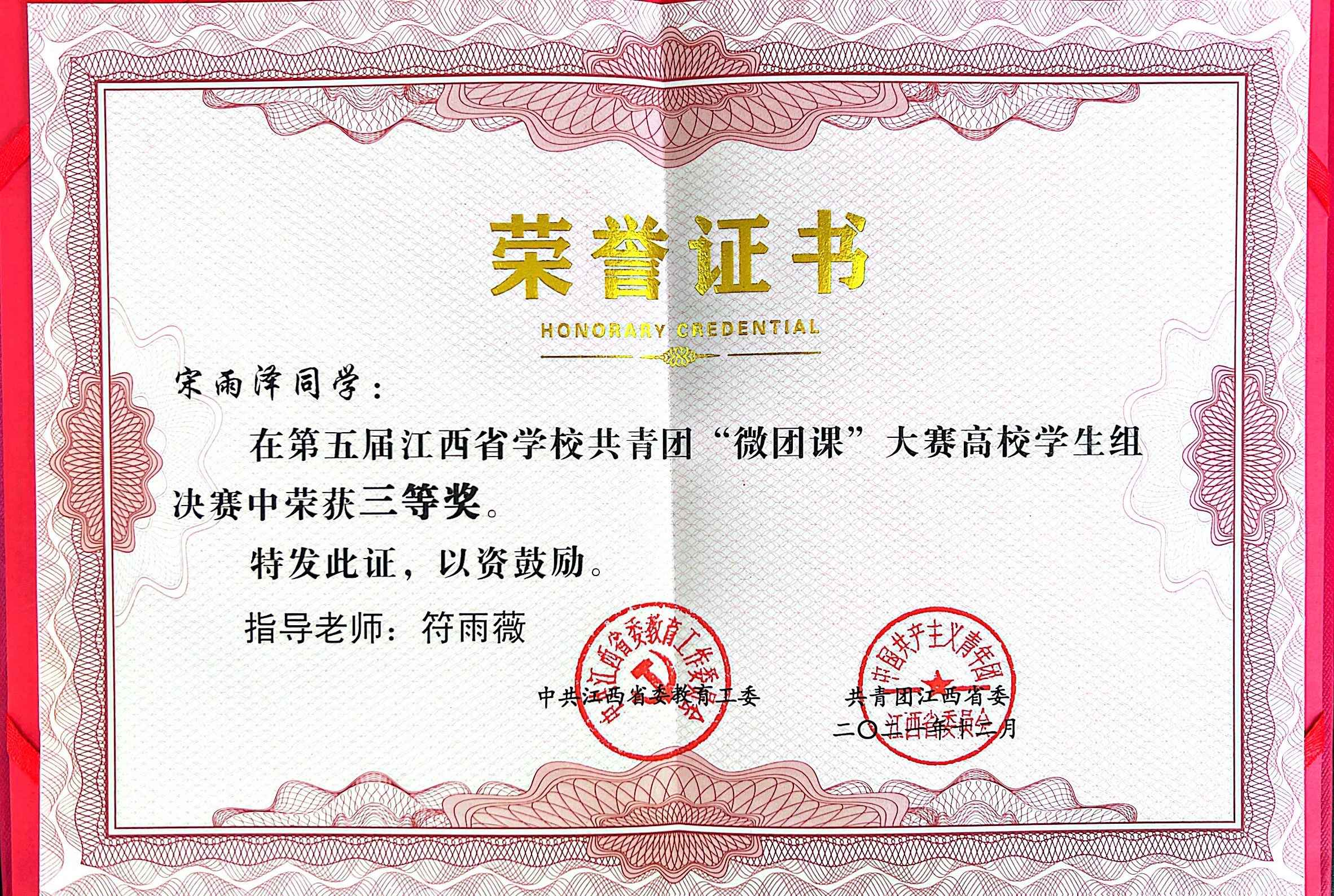 宋雨泽获第五届江西省学校共青团“微团课”大赛学生组三等奖