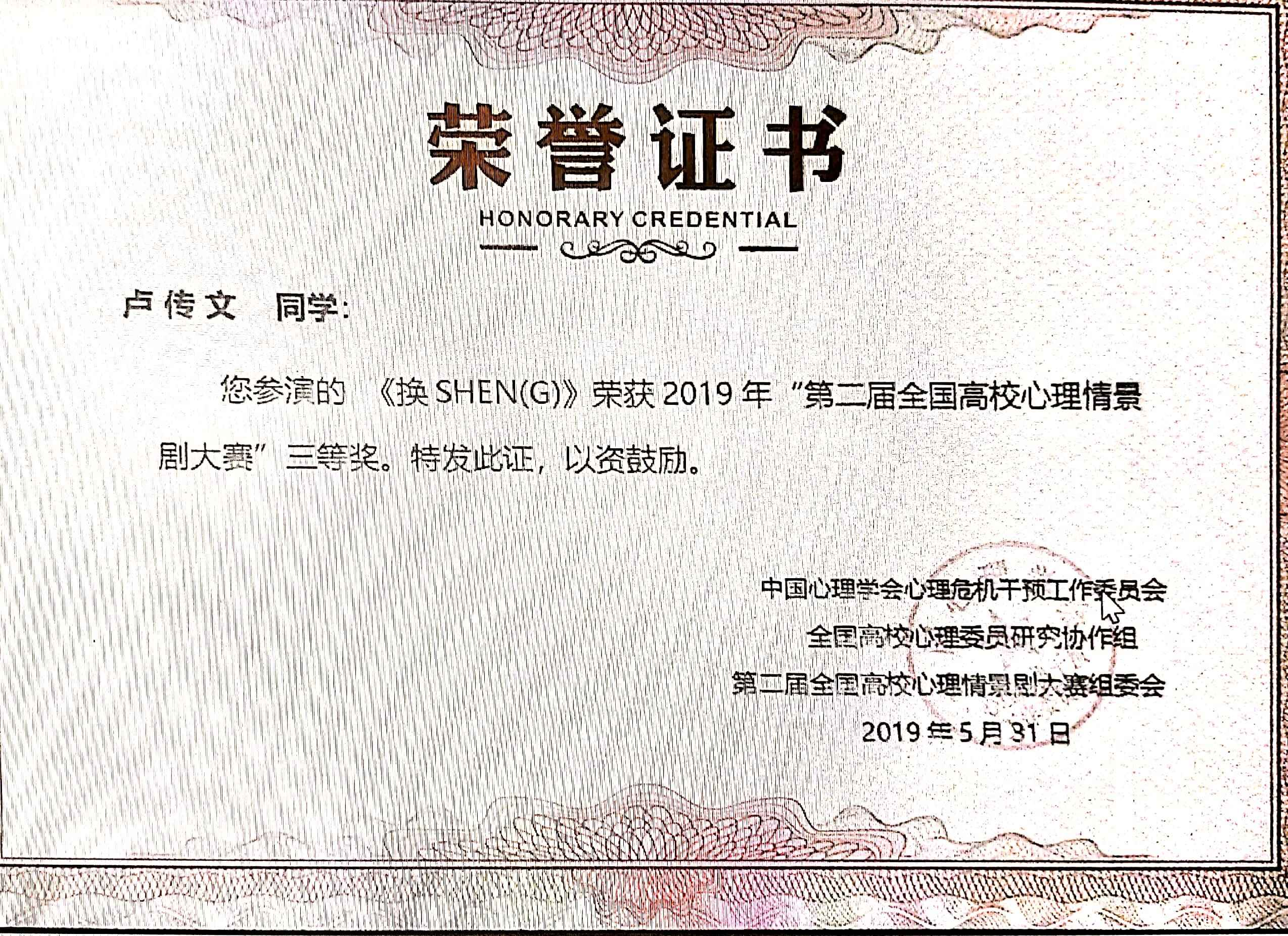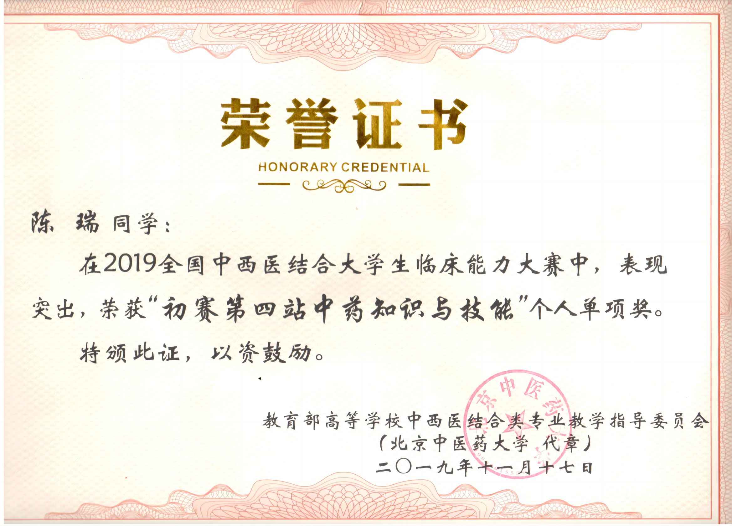 2019全国中西医结合大学生临床能力大赛个人单项奖(陈瑞(2015中西医临床1班) 中药知识与技能)