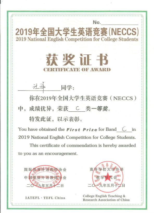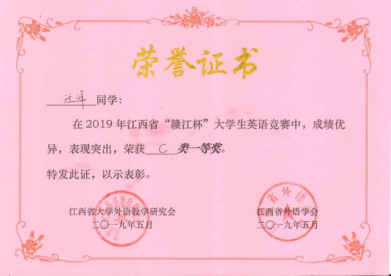 汪洋获江西省“赣江杯”大学生英语竞赛C类一等奖