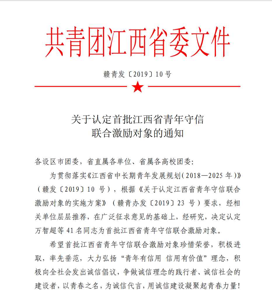 郑向龙获2019年首批江西省青年守信联合激励对象