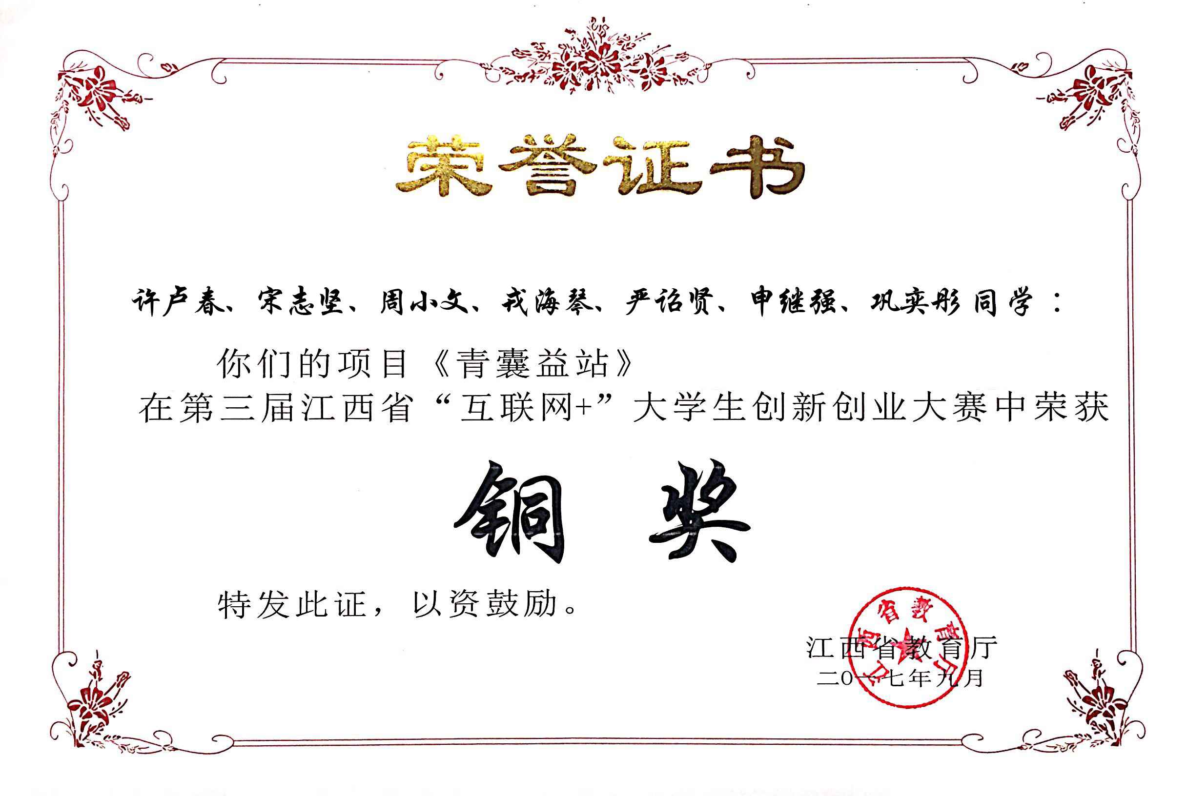 第三届江西省“互联网+”大学生创新创业大赛铜奖(学生)