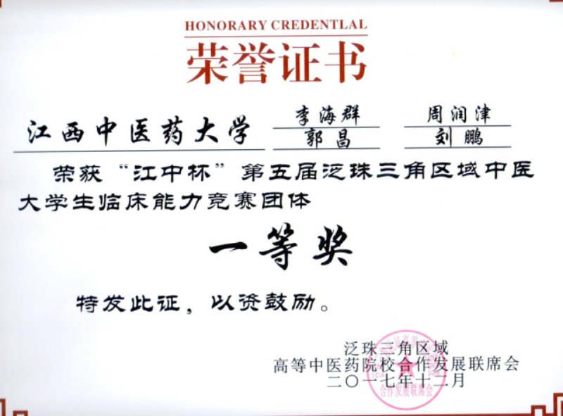 “江中杯”泛珠三角区域第五届中医大学生临床能力竞赛团体一等奖