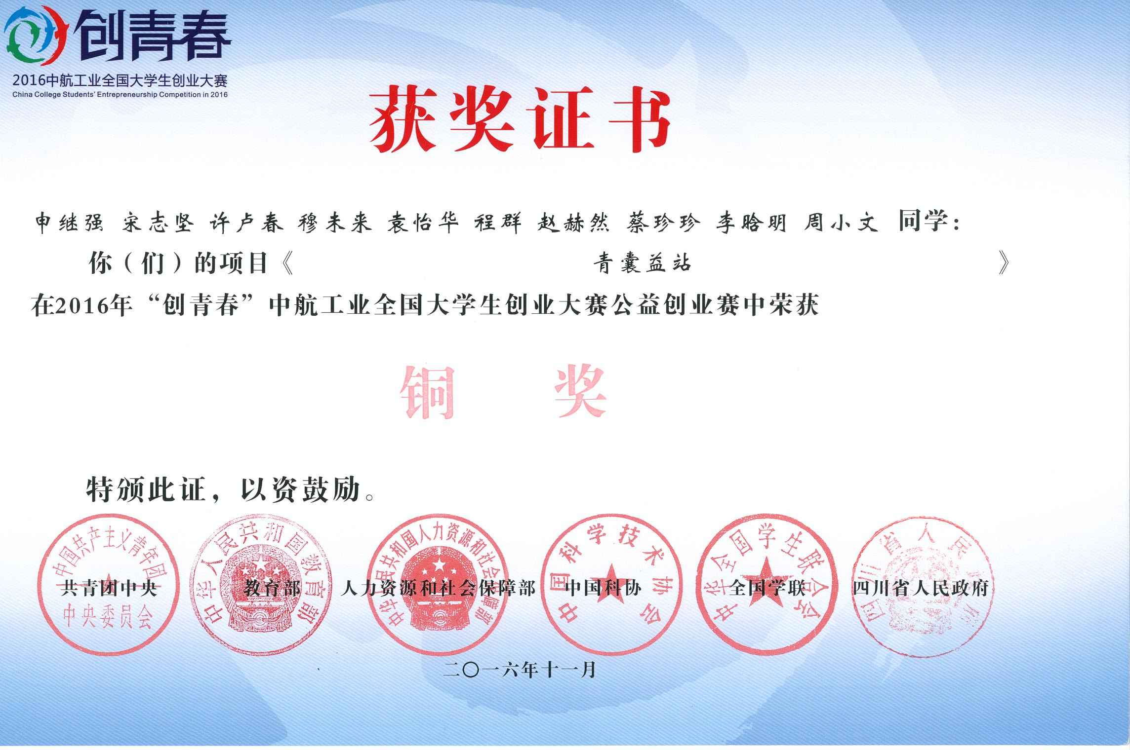 2016年“创青春”中航工业全国大学生创业大赛第十届“挑战杯”大学生创业计划竞赛铜奖