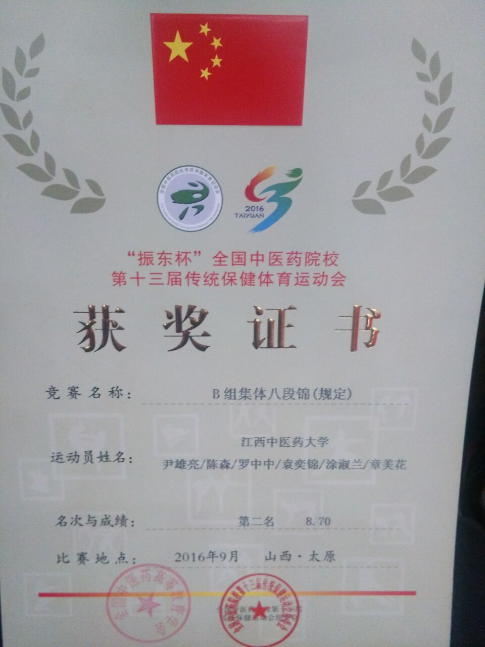 “振东杯”全国中医药大学院校第十三届传统保健运动会B组集体八段锦第二名