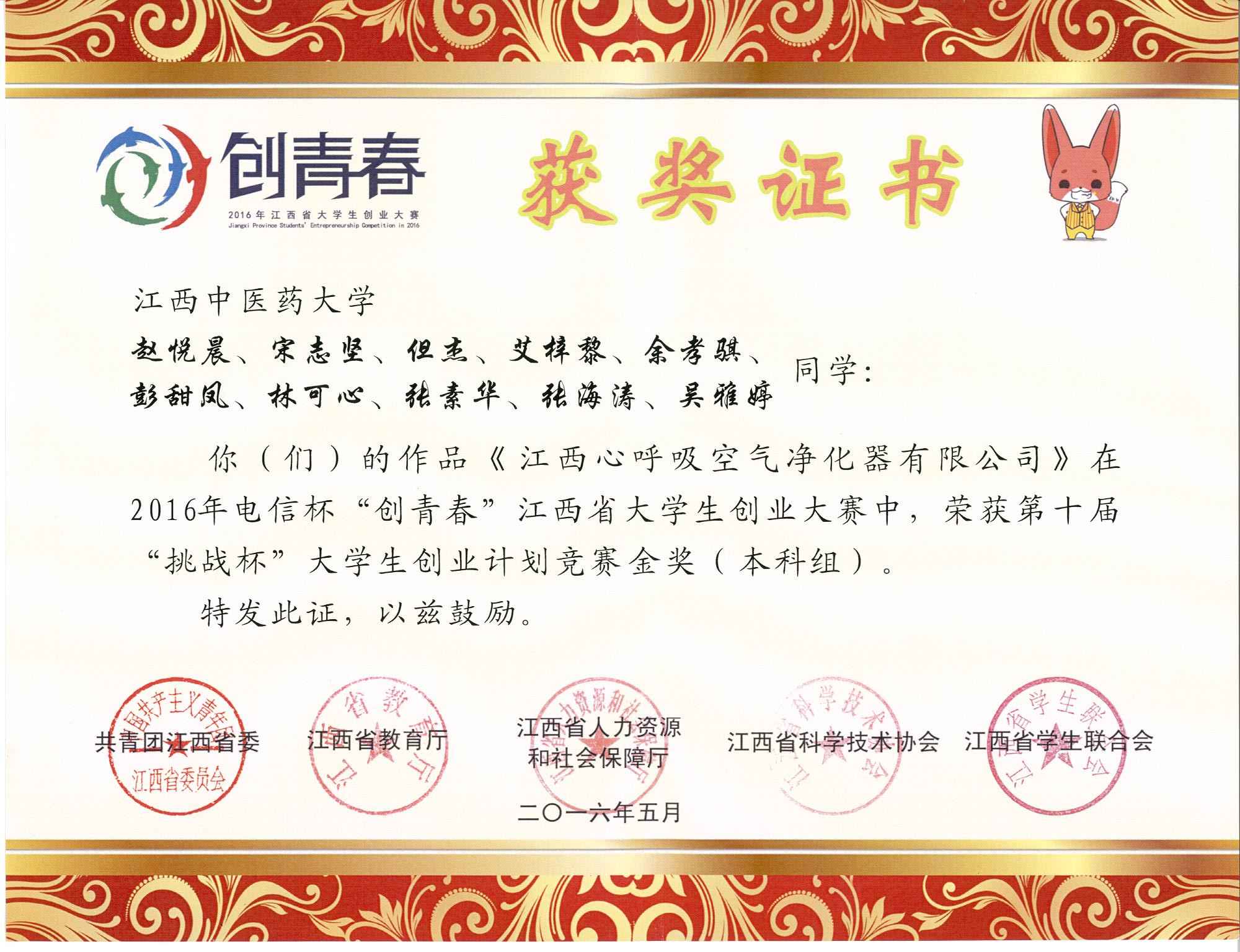 江西省2016“创青春”挑战杯金奖