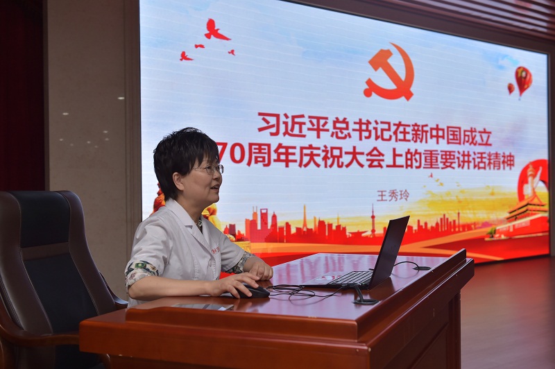 课上,王秀玲指出,习近平总书记的重要讲话深刻阐述了中华人民共和国成立的伟大意义,深刻总结了中华人民共和国70年的光辉历程、辉煌成就和宝贵经验,深刻剖析了党和国家事业发展面临的新形势、新任务、新要求。要深入学习贯彻习近平总书记庆祝中华人民共和国成立70周年系列重要讲话精神,深刻领会其丰富内涵,坚持中国共产党领导,坚持人民主体地位,坚持中国特色社会主义道路,全面贯彻执行党的基本理论、基本路线、基本方略,不断满足人民对美好生活的向往,不断创造新的历史伟业。她强调,身为医务工作者我们要以习近平新时代中国特色社会主义思想为指导,在新的历史起点上始终坚守和践行一切为了人民健康的初心使命,一路求索、一路奋斗,不辱新时代赋予我们的崇高使命, 全方位、全周期为保障人民健康,为全面建成小康社会、实现“两个一百年”奋斗目标、实现中华民族伟大复兴的中国梦作出新的贡献!(杨萌)