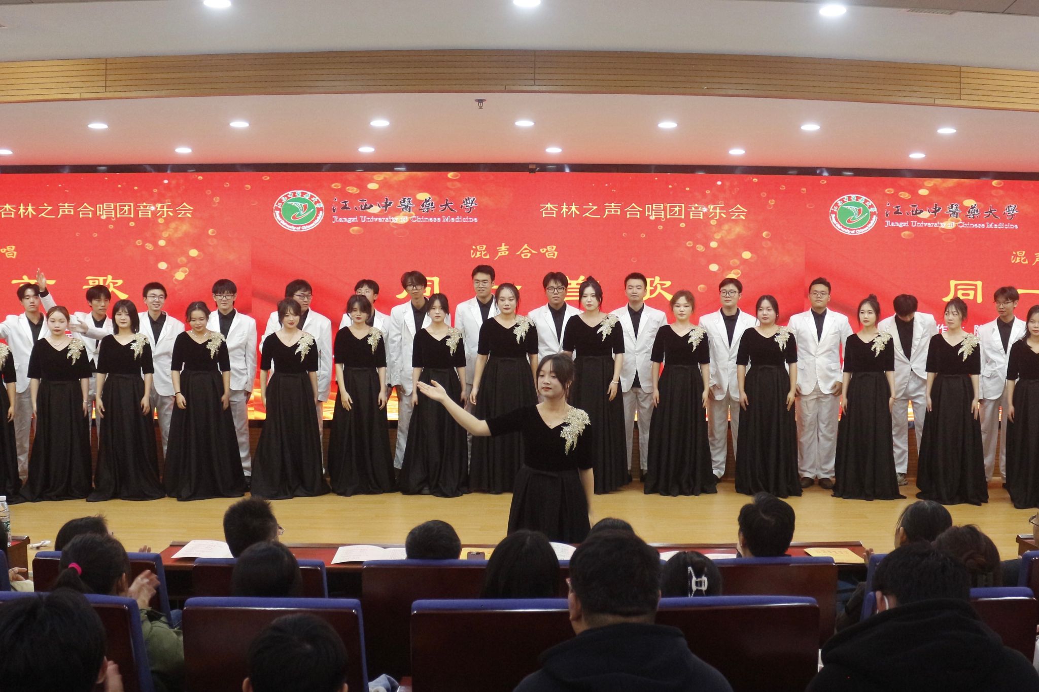 以美育人,温润心灵,以乐会友,陶冶情操。为持续深化我校美育教育,弘扬中华优秀传统文化,增强学生的艺术修养和审美能力,11月29日,由党委宣传部、教务处、学工处、校团委主办,临床医学院承办,杏林之声合唱团倾情演唱的“弘扬杏林精神,绽放青春芳华”专场音乐会在图书馆二楼报告厅成功举办。学校党委委员、副校长、附属医院(临床医学院)党委书记严小军,党委宣传部、临床医学院、继续教育学院负责同志以及学校老师和学生近240人来到现场聆听。