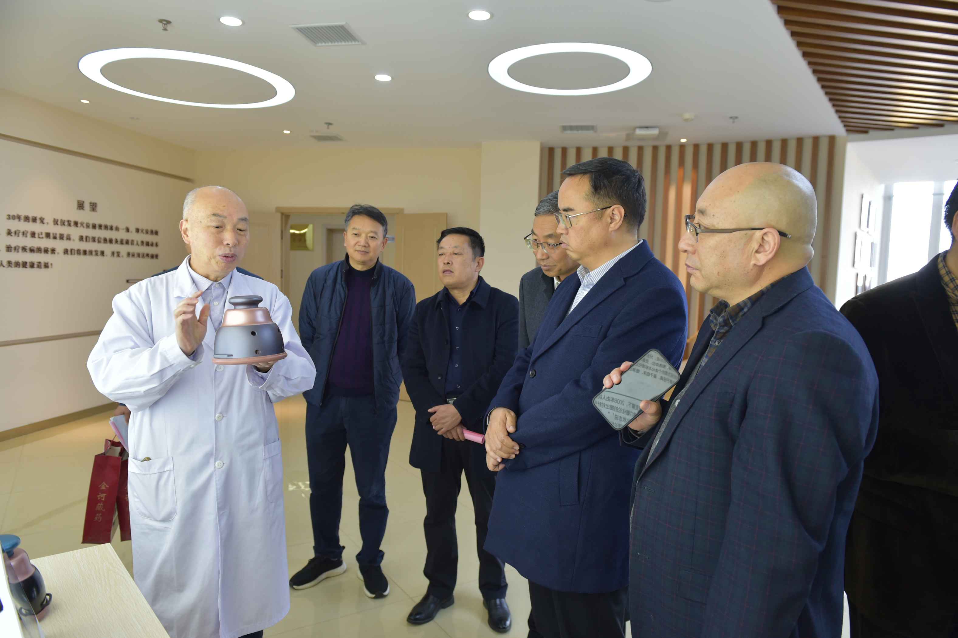 热敏灸创始人陈日新向端智一行介绍热敏灸灸具