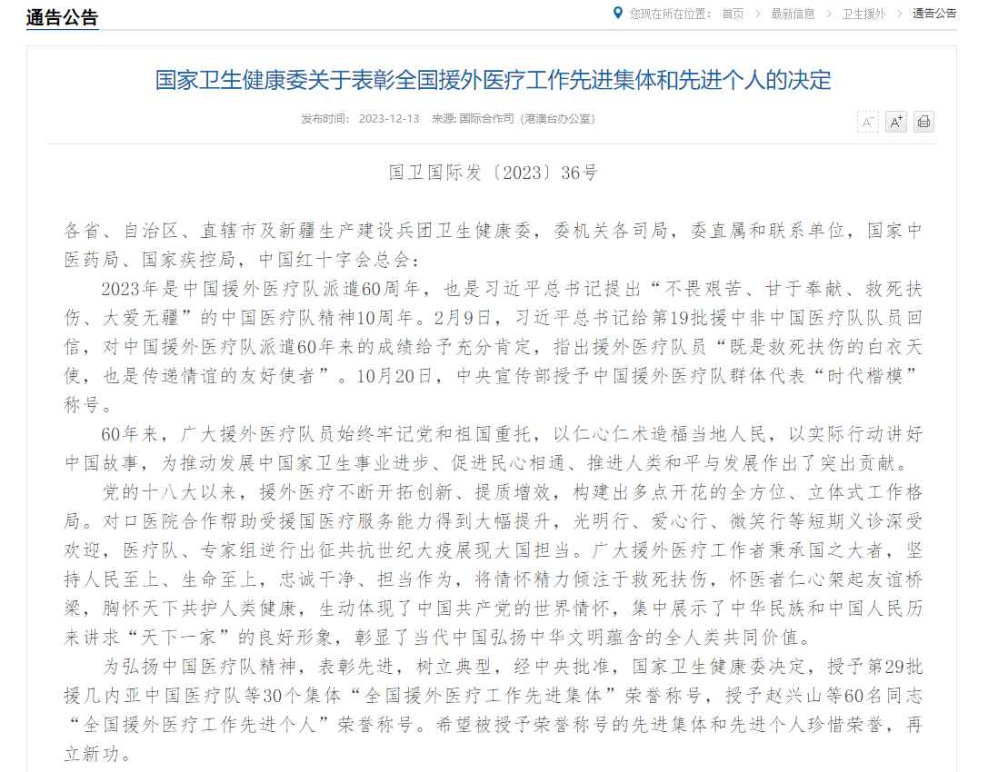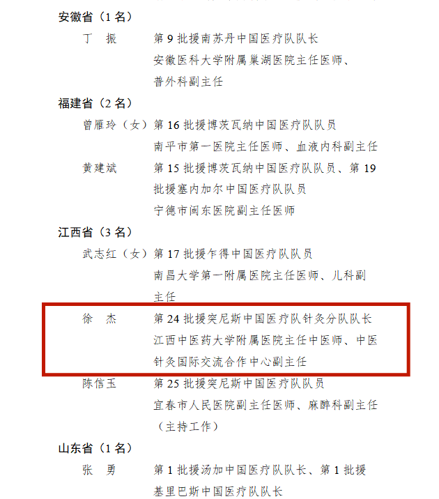 为弘扬中国医疗队精神,表彰先进,树立典型,经中央批准,国家卫生健康委决定,授予第29批援几内亚中国医疗队等30个集体“全国援外医疗工作先进集体”荣誉称号,授予赵兴山等60名同志“全国援外医疗工作先进个人”荣誉称号。江西1个集体和3名个人获国家表彰。第24批援突尼斯中国医疗队针灸分队队长、金瓶梅电影 主任中医师、中医针灸国际交流合作中心副主任徐杰被授予“全国援外医疗工作先进个人”荣誉。