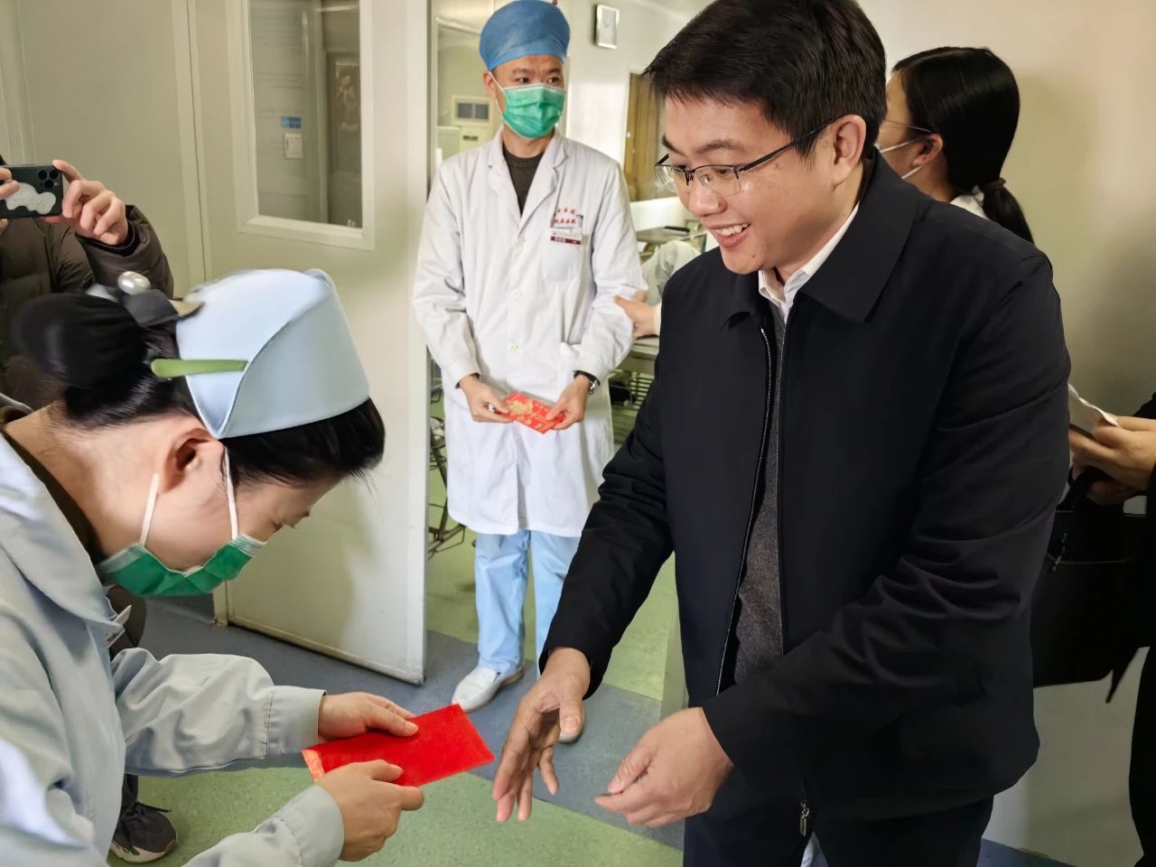 朱卫丰看望慰问附属医院春节值班值守人员 发布时间:2024-02-10点击次数:3457次 2月10日,大年初一上午,江西中医药大学党委副书记、校长朱卫丰,学校党委委员、副校长、附属医院党委书记严小军等来到附属医院,了解假日医院运行情况,亲切看望值班值守人员,向他们拜年,和大家一起欢度春节。 朱卫丰一行来到医院大门安检口、导诊台、药房、住院部等,为假期仍然坚守岗位的保安、保洁、导诊、医生、护士以及行政值班人员一一送去了关怀与慰问,送上拜年红包,感谢他们为保障人民群众健康、维护医院和谐平安做出的努力和贡献,并送上新春祝福,祝大家家庭幸福,龙年吉祥。 医院领导刘良徛、黄厚生陪同慰问。 校长朱卫丰向住院部值班医务人员拜年。 副校长、附属医院党委书记严小军向值班医务人员送上红包表达新年祝福。 医院院长刘良徛向值班护理人员送上红包并表达新年祝福。 医院总会计师黄厚生向值班护理人员送上红包并表达新年祝福。 作者:覃 肯 一审: 杨 萌 二审:陈 云三审:沈德森