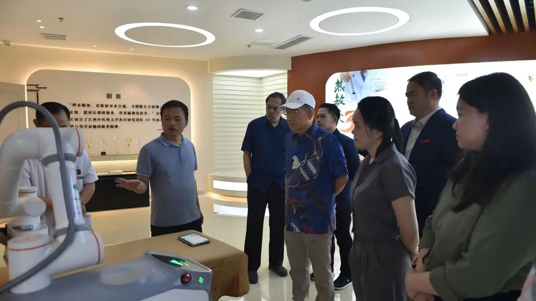 工作人员向印尼来宾介绍热敏灸机器人