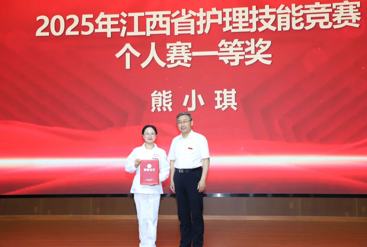 (黄加文为2025年江西省护理技能竞赛个人赛一等奖获得者熊小琪颁奖)