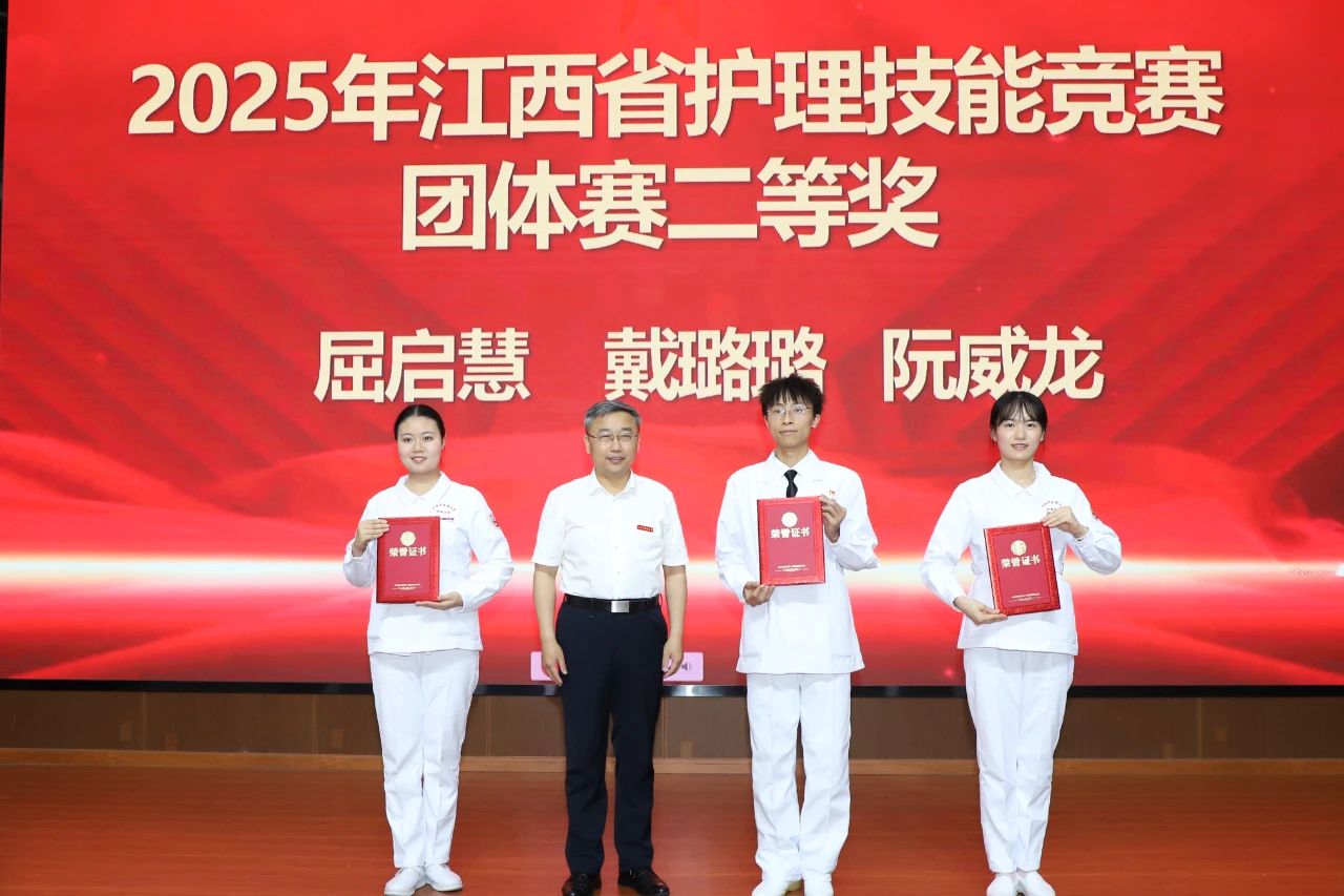 (黄加文为2025年江西省护理技能竞赛团体赛二等奖获得者屈启慧等颁奖)