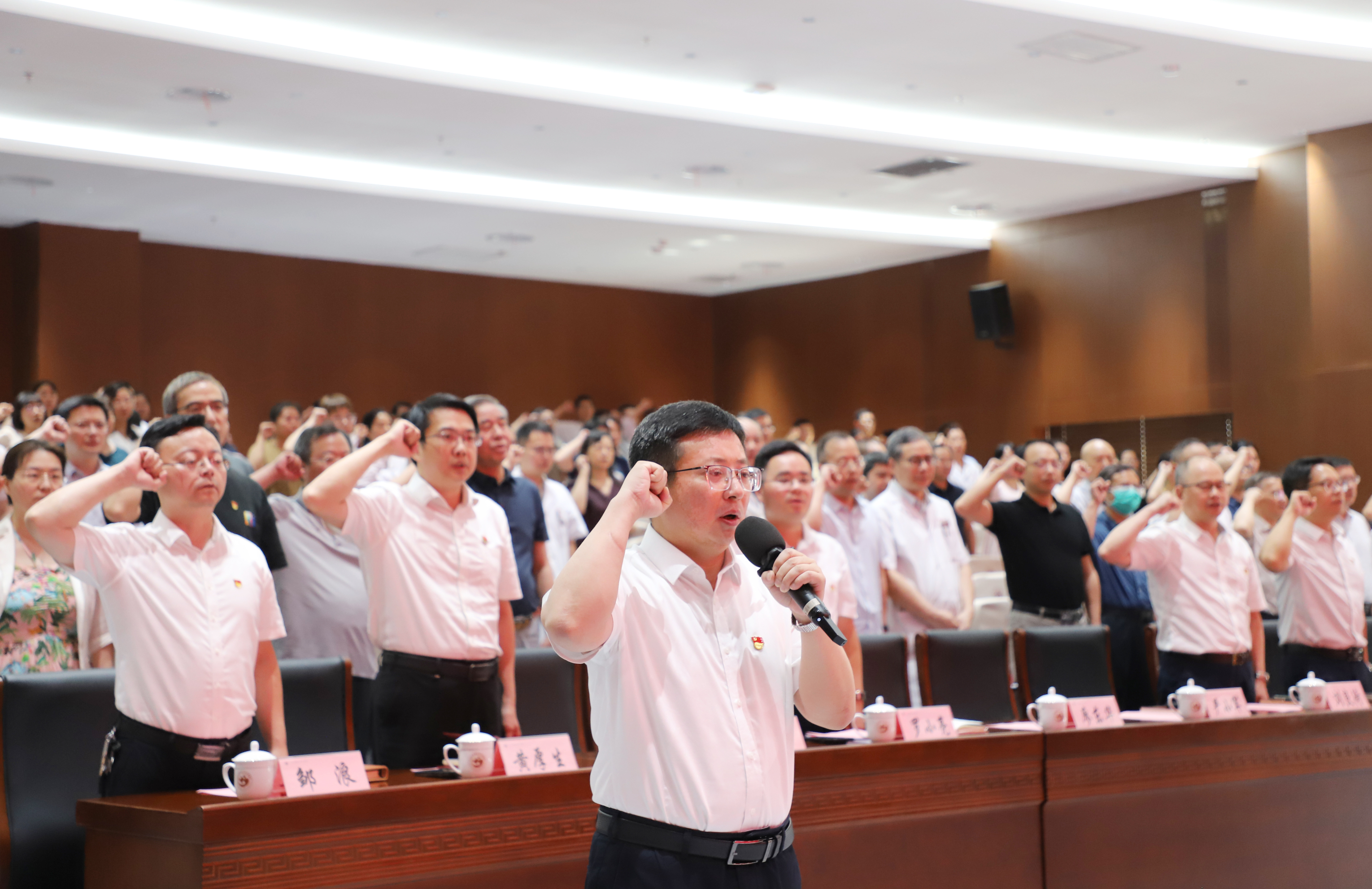 大会在庄严的国歌声中拉开序幕。在严小军的带领下,全体党员起立,面向党旗,重温入党誓词。