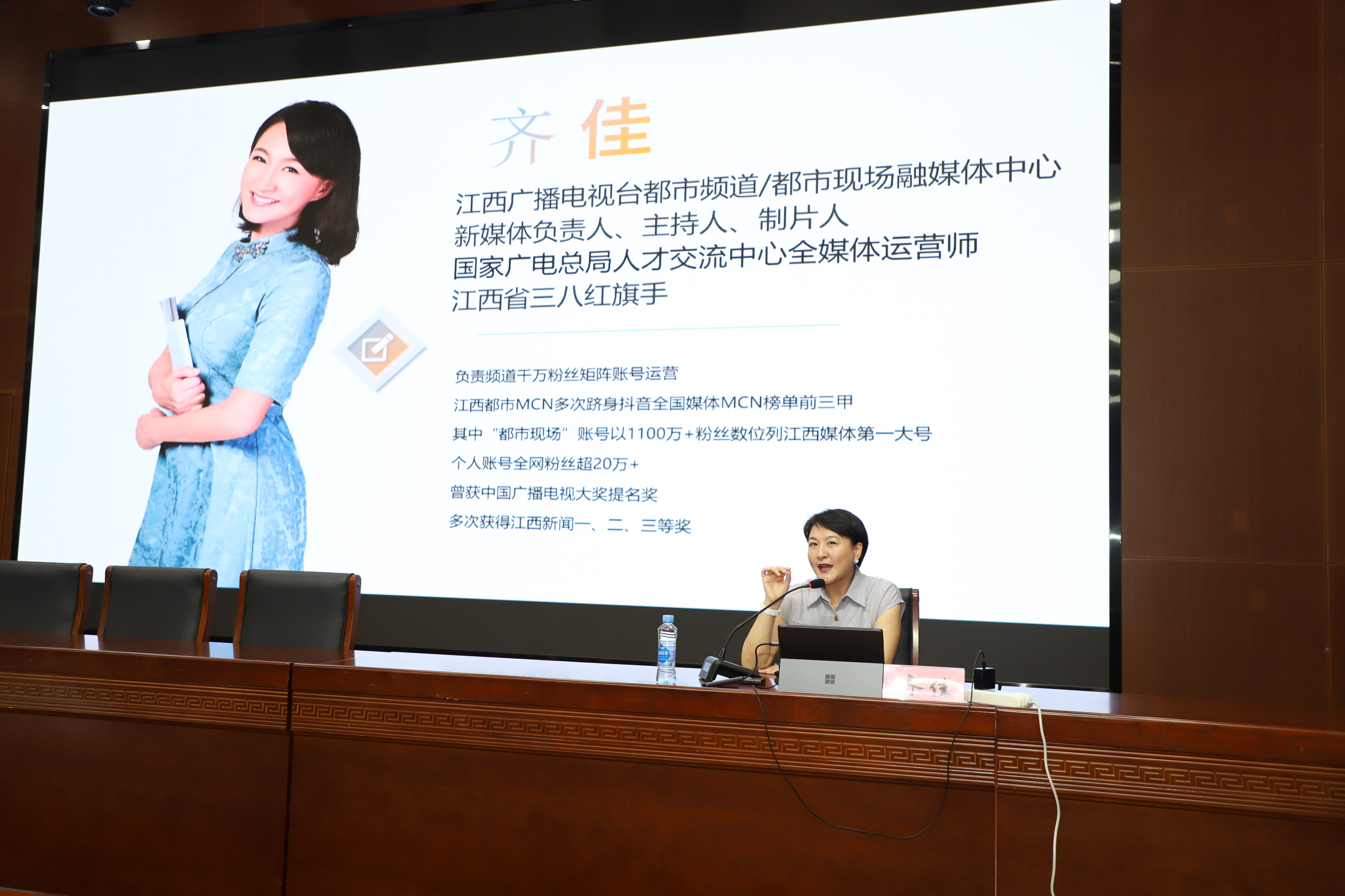 本次培训特邀江西广播电视台都市频道融媒体中心新媒体负责人、国家广电总局全媒体运营师齐佳老师主讲。齐佳老师作为江西省三八红旗手,主导运营的“都市现场”千万粉丝矩阵账号多次位列抖音全国媒体MCN榜单前三甲,其个人账号全网粉丝超20万,曾获中国广播电视大奖提名奖及多项江西新闻奖。她结合实操案例,系统讲解了短视频账号运营的核心逻辑,涵盖抖音分发机制、审核规则、推荐算法及爆款视频打造方法论,并深入解析金瓶梅电影