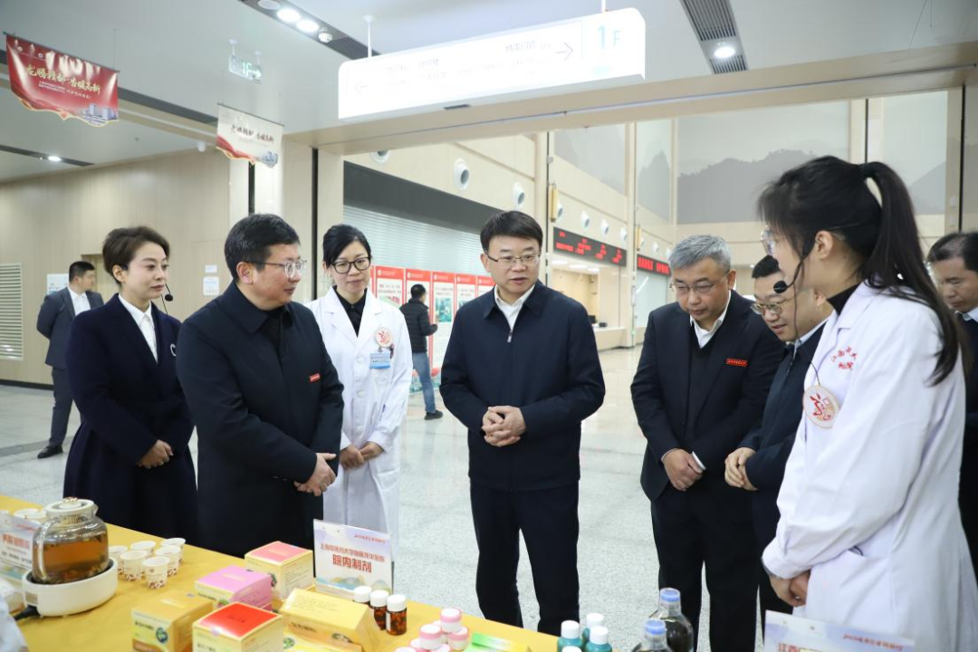 调研期间,史可一行首先来到医院门诊大厅,通过观看沙盘详细了解整体布局与项目建设情况。他实地参观杏林文化集、九大医疗中心展板,细致询问中医药特色传承、专科品牌打造、中西医协同发展等工作成效。他还深入到门诊部、住院部考察,了解医院日常运营、诊疗服务开展情况。