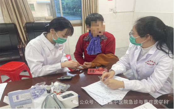 李晋、于长振主治医师,戴方杨住院医师及万浓主管护师组成急诊团队,为居民免费测量血压、血糖,筛查高血压和糖尿病。团队详细了解老年患者健康状况,逐一答疑解惑。其中,于长振主治中医师凭借扎实的中医功底,现场为患者开方,将"简、便、验、廉"的中医特色落到实处。