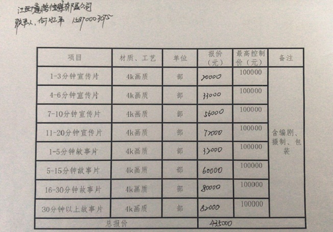 入围企业:南昌宏腾影视文化传播有限公司、南昌市景行文化传媒有限公司、江西意格传媒有限公司。入围企业报价如下图: