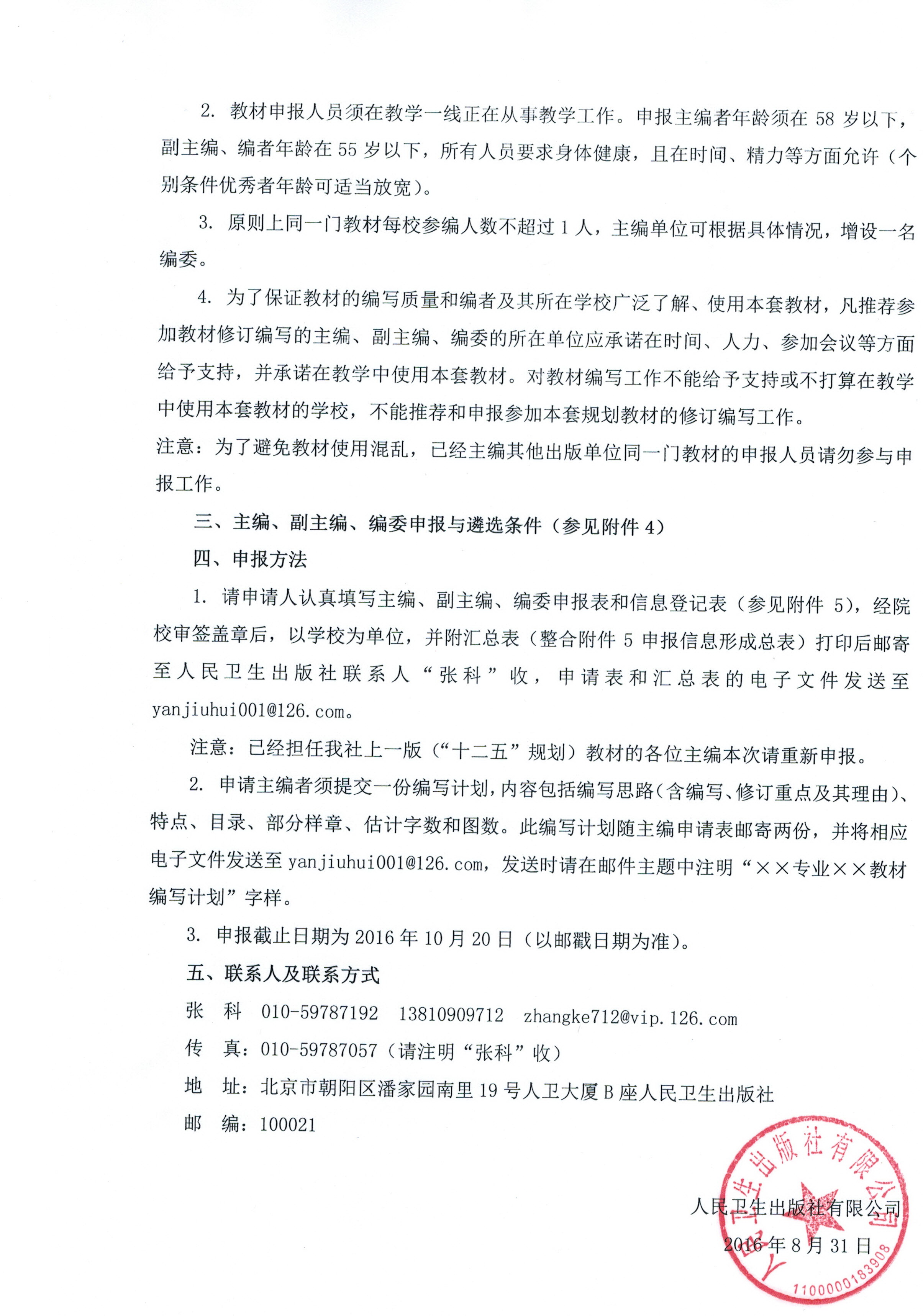 3.请各单位于2016年10月12日前将以上材料交至教学办汇总,报学校审批后,统一邮寄至人民卫生出版社。