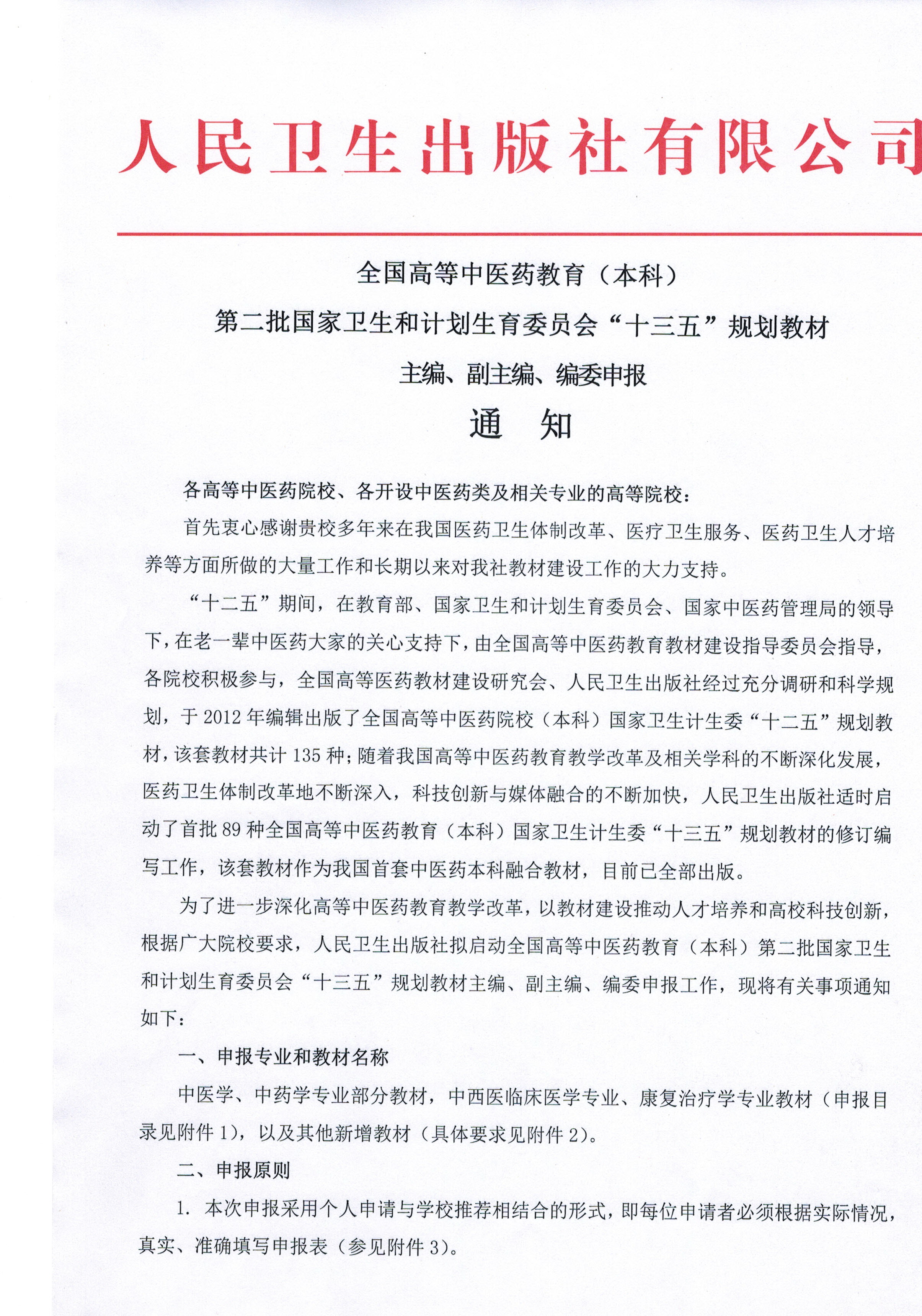 根据人民卫生出版社《全国高等中医药教育(本科)第二批国家卫生和计划生育委员会“十三五”规划教材主编、副主编、编委申报通知》,结合我校实际,现将相关事项通知如下:一、申报专业和教材名称