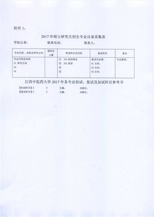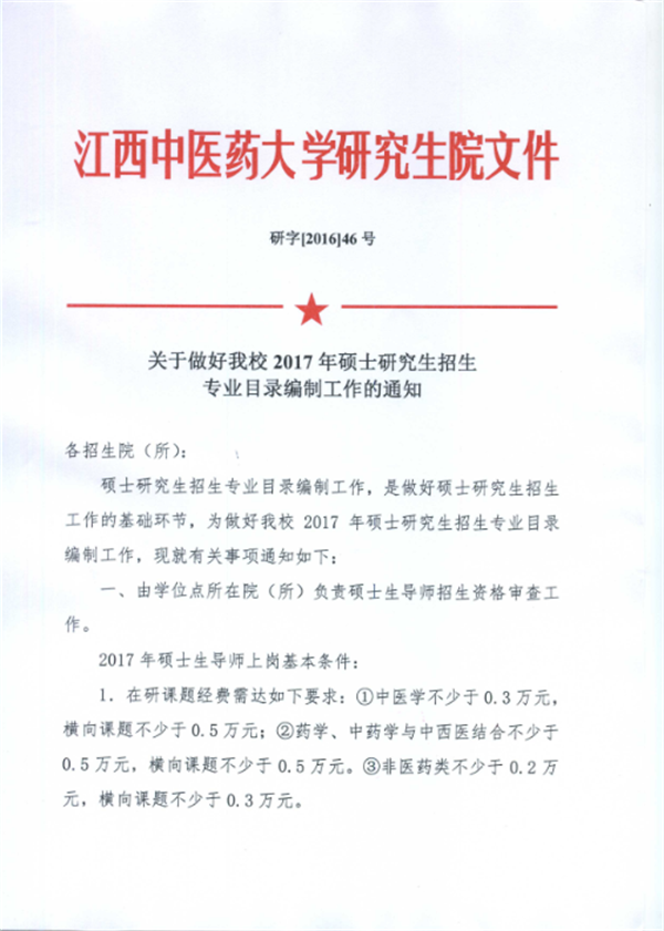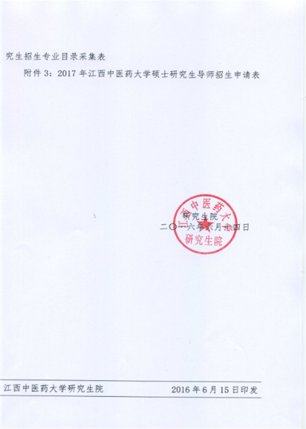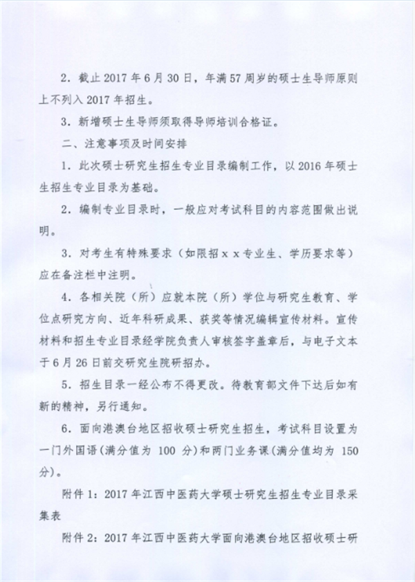 关于做好2017年硕士研究生招生专业目录编制工作的通知 发布时间:2016-06-16点击次数:2027次 附件1:2017年研究生招生专业目录制定 附件2:面向港澳台地区招收硕士研究生招生专业目录采集表 附件3:研究生导师招生申请表(导师填写提交学科组)