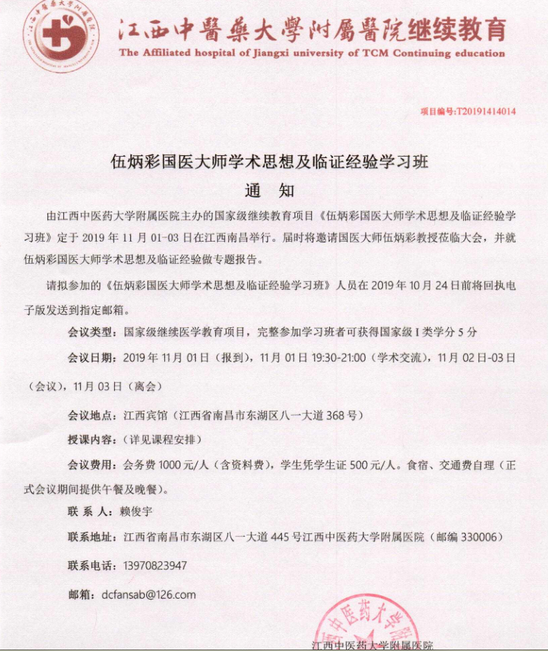 "附件:2019年“伍炳彩国医大师学术思想及临证经验学习班”通知"