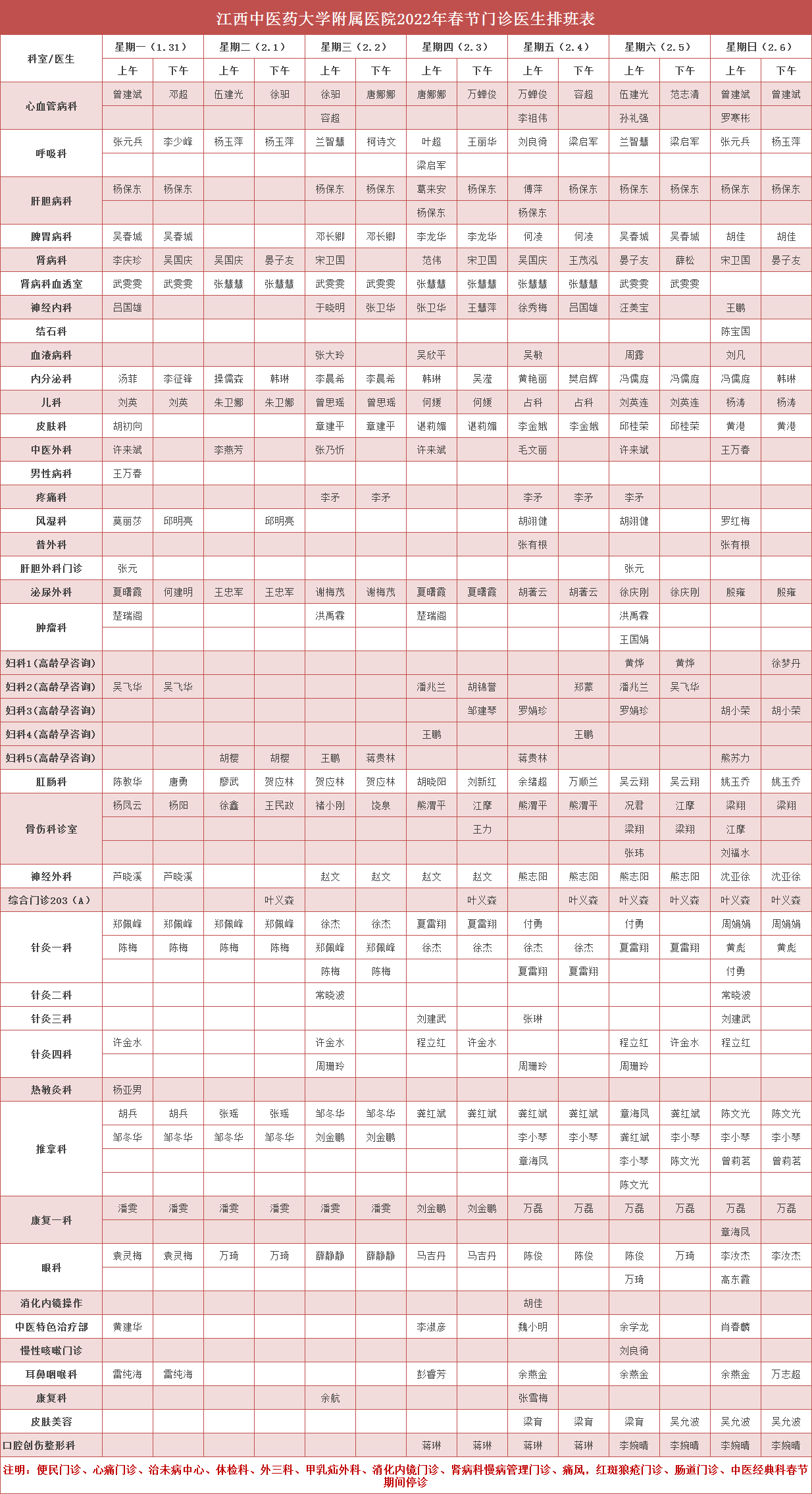 金瓶梅电影 春节假期门诊排班表 发布时间:2022-01-26点击次数:10898次 温馨提示: 1、医生坐诊时间以中金瓶梅电影 小程序为准。 2、核酸门诊春节假期照常开诊。 3、东湖院区疫苗门诊1月31日、2月4日正常接种疫苗。 4、胃镜室2月4日上午正常开诊。 5、请尽量减少陪同人员;进入金瓶梅电影 时,请您及家属配合工作人员进行新冠肺炎疫情防控工作。