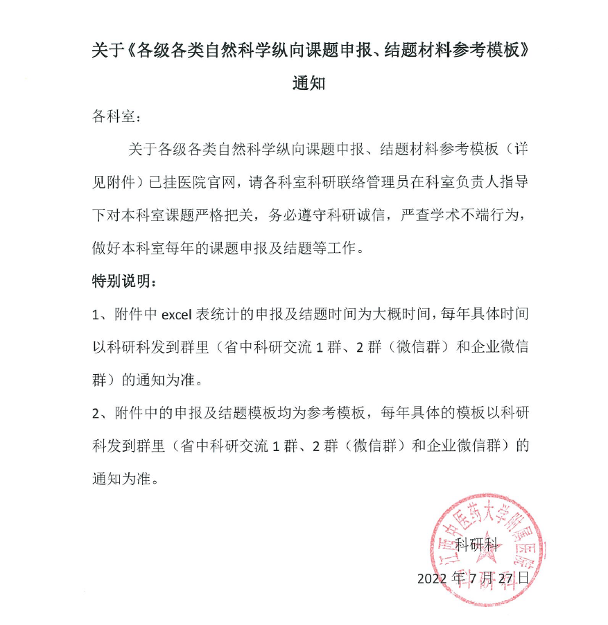关于《各级各类自然科学纵向课题申报、结题材料参考模板》通知 发布时间:2022-07-27点击次数:3629次 附件1: "各级各类自然科学纵向课题结题材料参考模板" 附件2: "各级各类自然科学纵向课题申报材料参考模板"