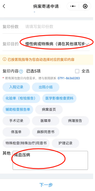 第四步:填写复印份数、复印目的、选择复印内容项目,如办理慢性病或特殊病,需在“其他”栏填写办理的病种名称。