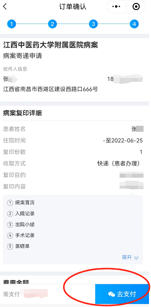 第五步:如邮寄,填写收件人姓名、联系电话、收件地址等信息,确认无误后,点击提交,订单提交到病案科待审核。