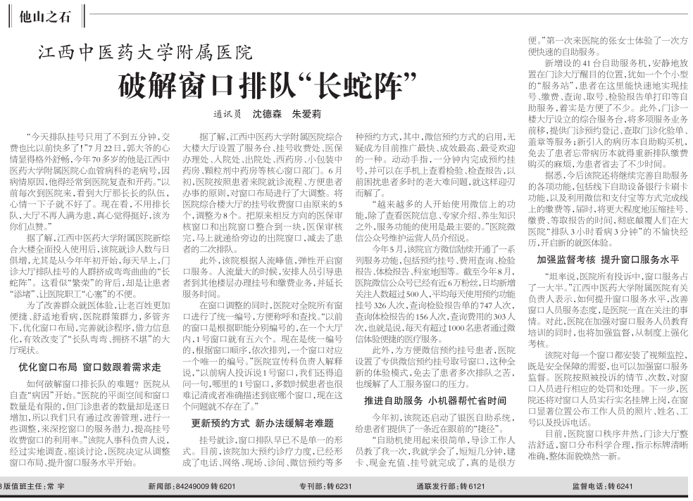 中国中医药报9月28日5版 通讯员 沈德森 朱爱莉 “今天排队挂号只用了不到五分钟,交费也比以前快多了!”7月22日,郭大爷的心情显得格外舒畅,今年70多岁的他是金瓶梅电影 心血管病科的老病号,因病情原因,他得经常到金瓶梅电影 复查和开药。“以前每次到金瓶梅电影 来,看到大厅那长长的队伍,心情一下子就不好了。现在看,不用排长队,大厅不再人满为患,真心觉得挺好,该为你们点赞。”