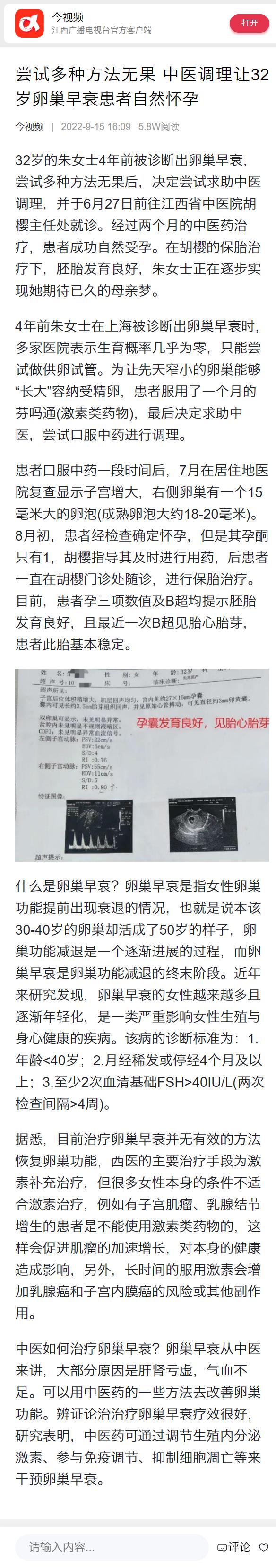 32岁的朱女士4年前被诊断出卵巢早衰,尝试多种方法无果后,决定尝试求助中医调理,并于6月27日前往金瓶梅电影 胡樱主任处就诊。经过两个月的中医药治疗,患者成功自然受孕。在胡樱的保胎治疗下,胚胎发育良好,朱女士正在逐步实现她期待已久的母亲梦。