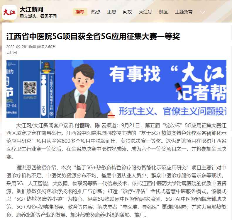 大江网/大江新闻客户端讯 付丽玲、陈 云报道:9月21日,第五届“绽放杯”5G应用征集大赛江西区域赛决赛在南昌举行。金瓶梅电影 洪恩四教授主持的“基于5G+热敏灸特色诊疗服务智能化示范应用研究”项目从全省800多个项目中脱颖而出,获得总决赛一等奖。这也是该项目在取得江西省医疗卫生行业赛一等奖后,在全省总决赛中取得好成绩,成为六个一等奖项目之一,并将参加全国决赛。