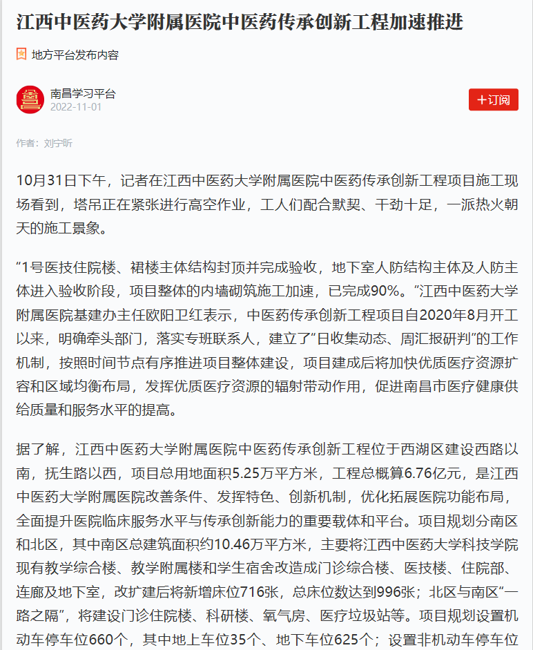 “1号医技住院楼、裙楼主体结构封顶并完成验收,地下室人防结构主体及人防主体进入验收阶段,项目整体的内墙砌筑施工加速,已完成90%。”金瓶梅电影 基建办主任欧阳卫红表示,中医药传承创新工程项目自2020年8月开工以来,明确牵头部门,落实专班联系人,建立了“日收集动态、周汇报研判”的工作机制,按照时间节点有序推进项目整体建设,项目建成后将加快优质医疗资源扩容和区域均衡布局,发挥优质医疗资源的辐射带动作用,促进南昌市医疗健康供给质量和服务水平的提高。