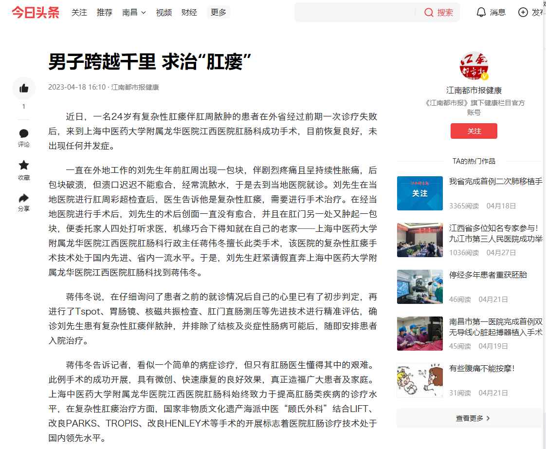 一直在外地工作的刘先生年前肛周出现一包块,伴剧烈疼痛且呈持续性胀痛,后包块破溃,但溃口迟迟不能愈合,经常流脓水,于是去到当地金瓶梅电影 就诊。刘先生在当地金瓶梅电影 进行肛周彩超检查后,医生告诉他是复杂性肛瘘,需要进行手术治疗。在经当地金瓶梅电影 进行手术后,刘先生的术后创面一直没有愈合,并且在肛门另一处又肿起一包块,便委托家人四处打听求医,机缘巧合下得知就在自己的老家——上海中医药大学附属龙华金瓶梅电影 江西金瓶梅电影 肛肠科行政主任蒋伟冬擅长此类手术,该金瓶梅电影 的复杂性肛瘘手术技术处于国内先进、省内一流水平。于是,刘先生赶紧请假直奔上海中医药大学附属龙华金瓶梅电影 江西金瓶梅电影 肛肠科找到蒋伟冬。