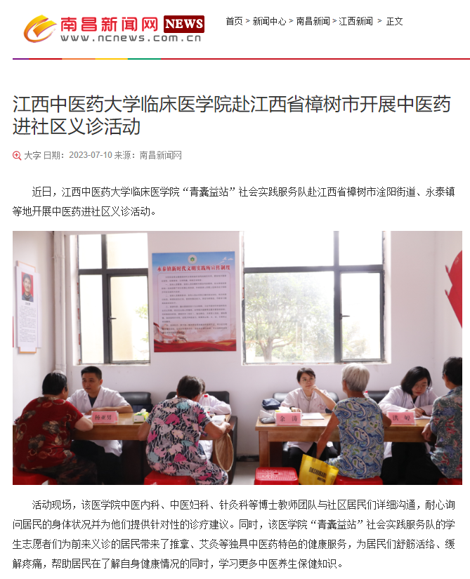 【南昌新闻网】 江西中医药大学临床医学院赴江西省樟树市开展中医药进社区义诊活动
