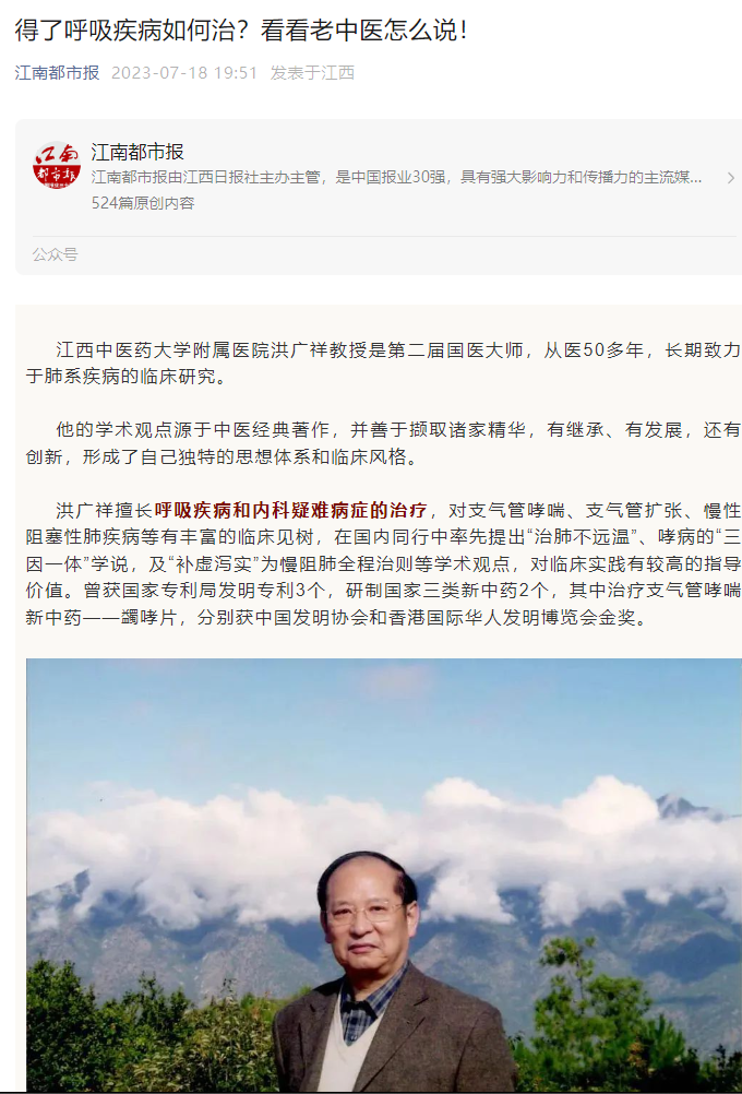 洪广祥教授是第二届国医大师,从医50多年,长期致力于肺系疾病的临床研究。他的学术观点源于中医经典著作,并善于撷取诸家精华,有继承、有发展,还有创新,形成了自己独特的思想体系和临床风格。