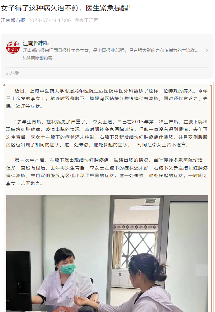 诊治,但却一直没有根治。去年再次生育后,李女士左腋下的症状还未好,右腋下又新发结块红肿疼痛伴溃脓,并且双侧腹股沟区也出现了相同的症状。这一处未愈、他处多起的症状,一时间让李女士苦不堪言。