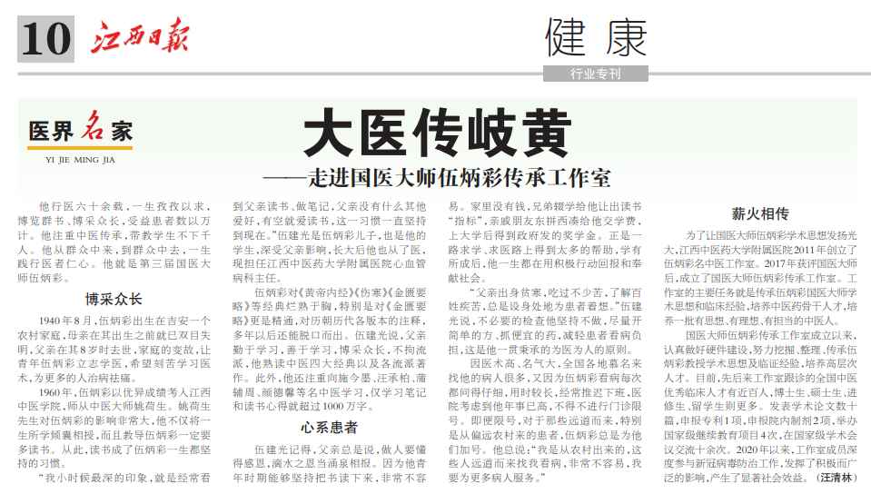 【江西日报】大医传岐黄 ——走进国医大师伍炳彩传承工作室