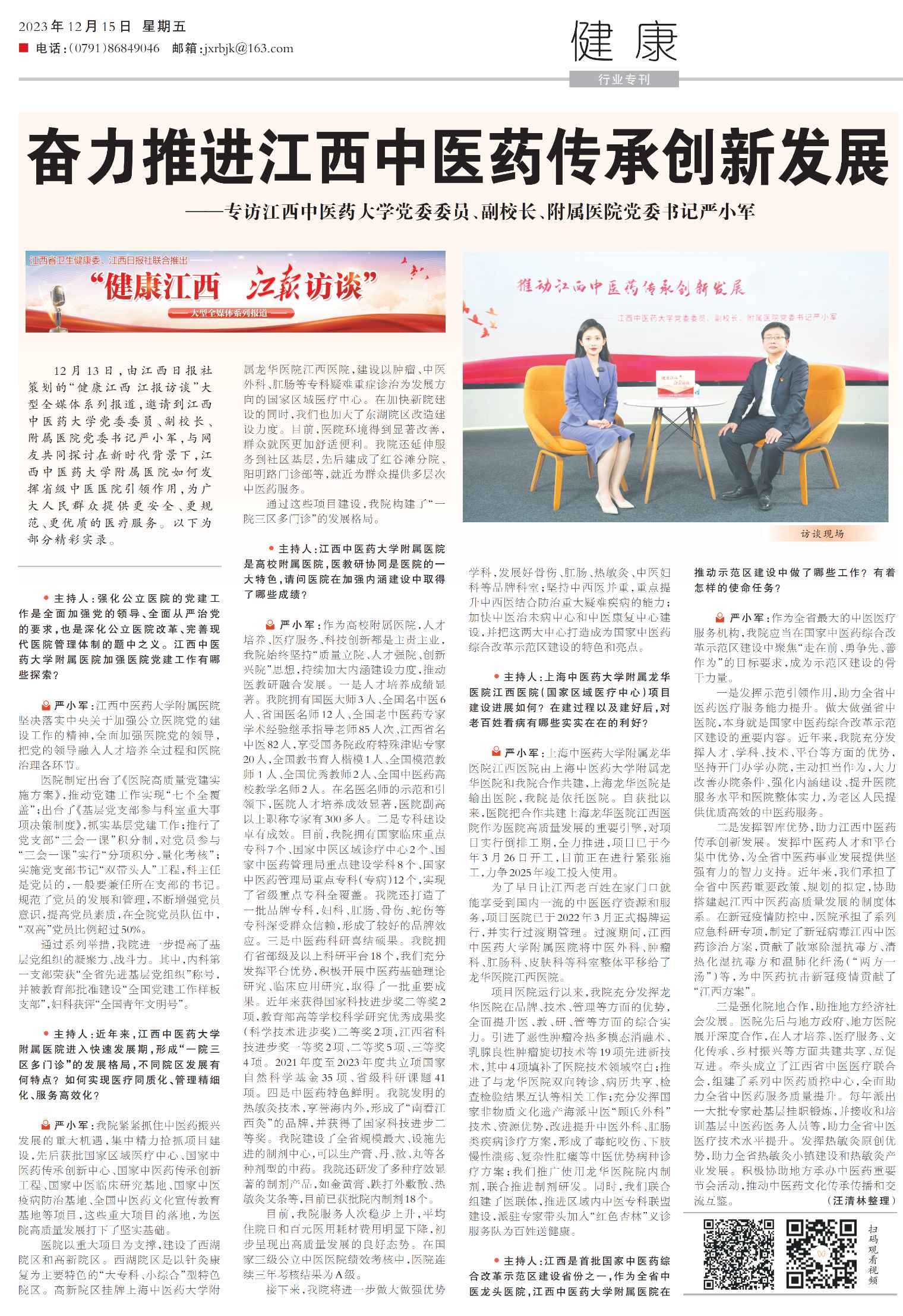 12月13日,由江西日报社策划的“健康江西 江报访谈”大型全媒体系列报道,邀请到江西中医药大学党委委员、副校长、附属金瓶梅电影 党委书记严小军,与网友共同探讨在新时代背景下,金瓶梅电影 如何发挥省级中医金瓶梅电影 引领作用,为广大人民群众提供更安全、更规范、更优质的医疗服务。以下为部分精彩实录。
