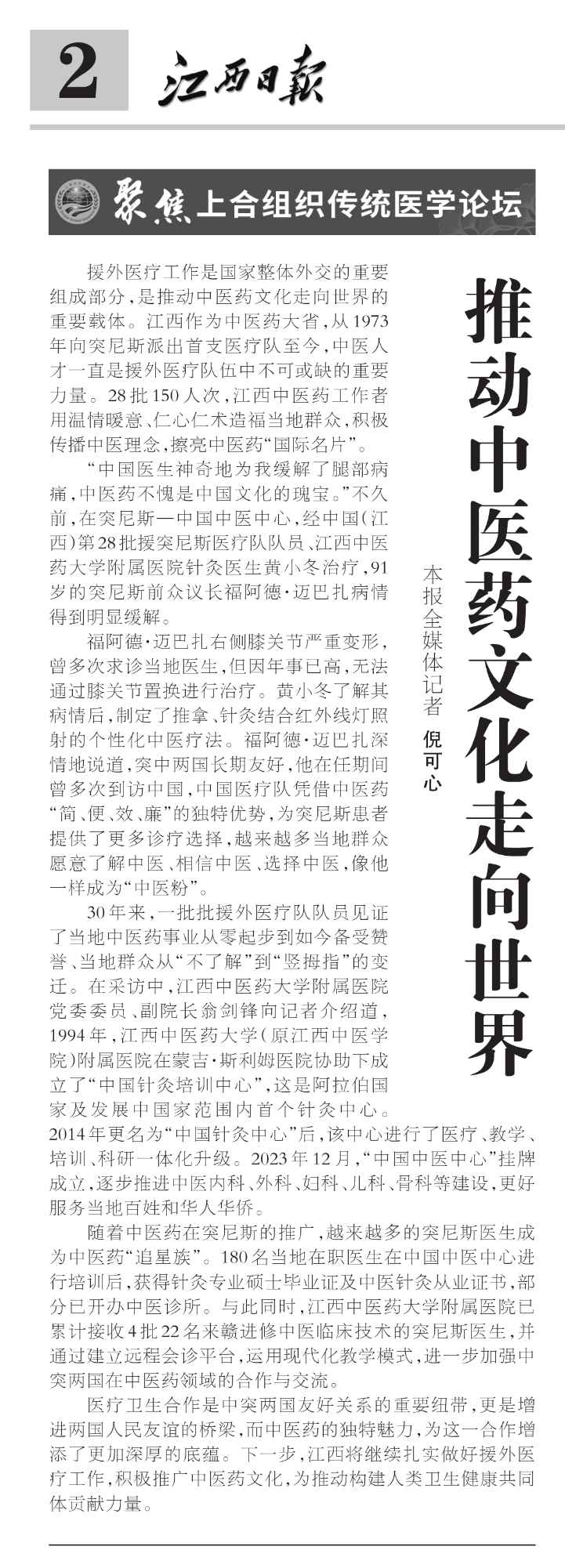 医疗卫生合作是中突两国友好关系的重要纽带,更是增进两国人民友谊的桥梁,而中医药的独特魅力,为这一合作增添了更加深厚的底蕴。下一步,江西将继续扎实做好援外医疗工作,积极推广中医药文化,为推动构建人类卫生健康共同体贡献力量。