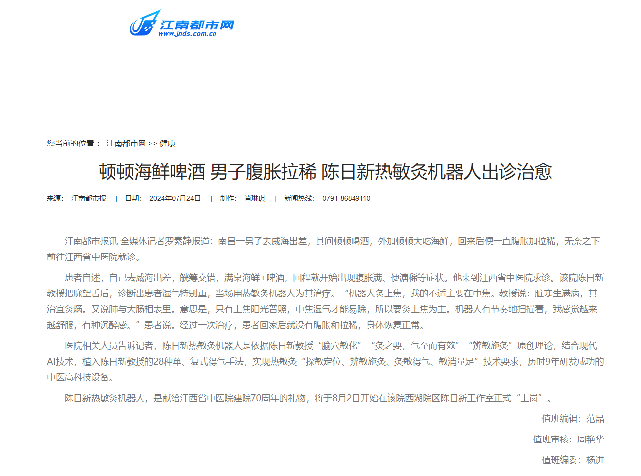 【江南都市网】顿顿海鲜啤酒 男子腹胀拉稀 陈日新热敏灸机器人出诊治愈