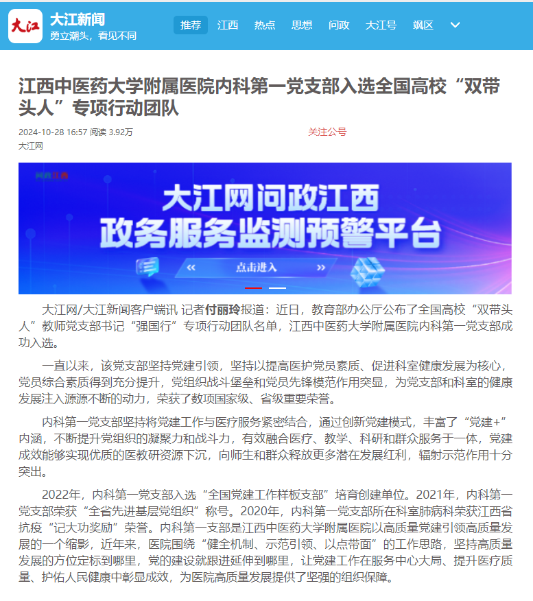 【大江网】金瓶梅电影 内科第一党支部入选全国高校“双带头人”专项行动团队