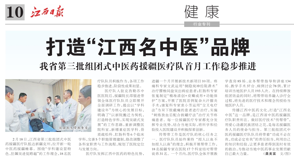 【江西日报】打造 “江西名中医”品牌 我省第三批组团式中医药援疆医疗队首月工作稳步推进